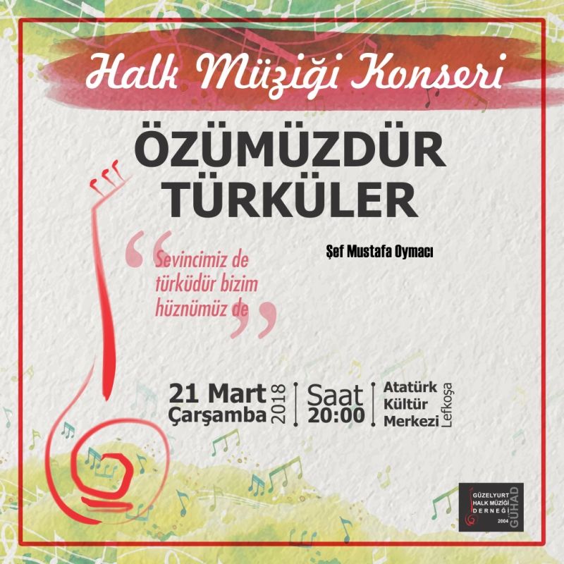 21 Mar 2018 Konser | GÜHAD ÖZÜMÜZDÜR TÜRKÜLER KONSERİ 21 Mart 2018 Konserimiz 21 Mart 2018 tarihinde Lefkoşa Atatürk Kültür Merkezinde, saat 20:00'de gerçekleşecektir. Giriş ücretsizdir.